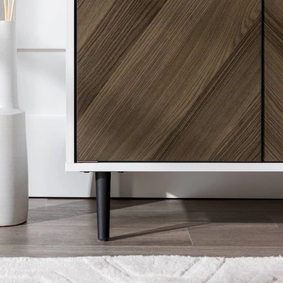 When looking to upgrade your interior design, look no further than Saracina Home’s Angelo Modern Bookmatch Accent Cabinet. Tapered metal legs and faux bookmatch door fronts add a retro twist to the modern, rectangular silhouette. With one adjustable shelf and a top surface that beckons your favorite décor, you can make this piece truly fit your needs and style. Use it as a boho accent cabinet in the living room, storage cabinet in a home office, or even a bar cabinet in the kitchen. Tie your home together when you pair the Angelo with other pieces from Saracina Home’s bookmatch collection.