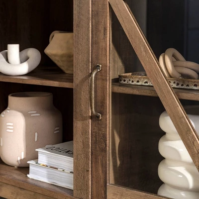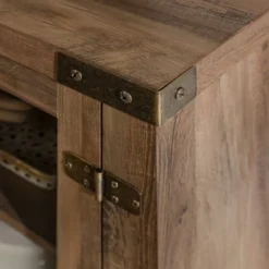 Farmhouse with a transparent twist, the Clarabelle Farmhouse Glass Barn Door 58” TV Stand from Saracina Home provides a fresh take on rustic style. Exposed, antiqued metal hinges and accents on the front of the entertainment center maintain an industrial vibe, while the tempered safety glass barn doors add a contemporary edge. This console features cord management ports and three adjustable shelves so you can keep your living room organized. The blend of open and semi-closed storage allows you to proudly display your fanciest media components and favorite movies.